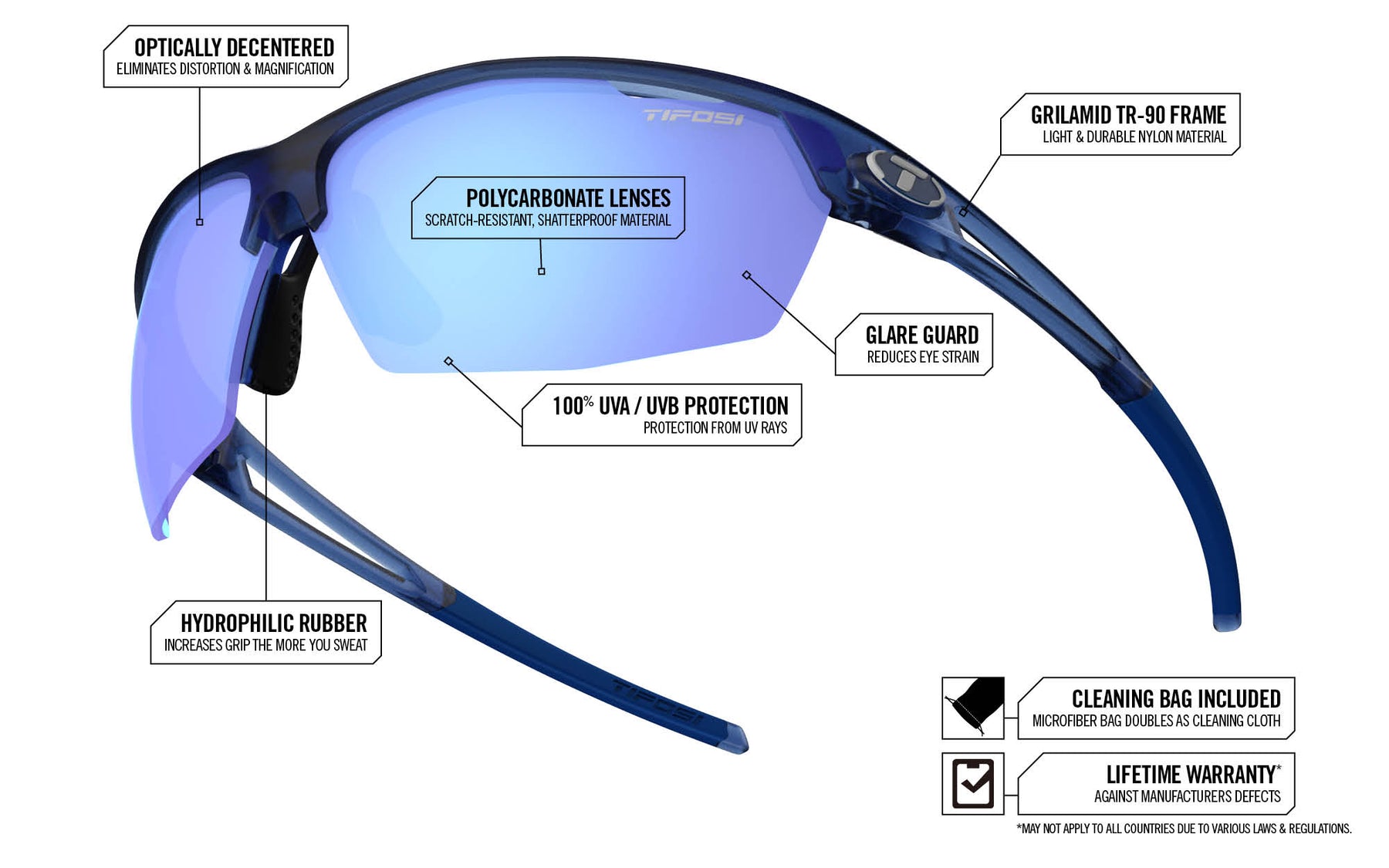 At Tifosi Optics™ we have built our name through our customer service and standing behind our product 100%. Therefore, we will warranty any sunglass against manufacturer’s defects to the original owner for the life of the product. Tifosi Optics will either replace or repair your glasses at our discretion. Learn more about warranty claims.