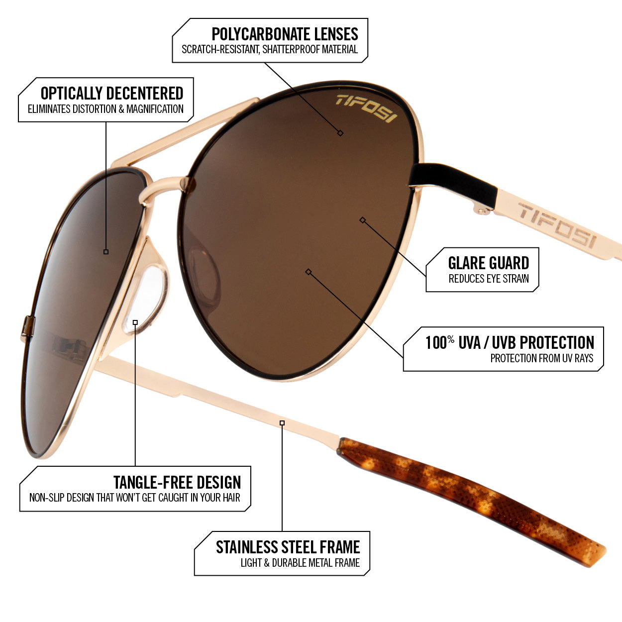 If you're seeking practical, stylish, and comfortable aviator sunglasses that won't pull your hair or get tangled, Tifosi's Shwae Tangle-Free Aviator Sunglasses are the perfect solution. Featuring Glide technology, hydrophilic rubber nose and ear pieces, and tangle-free nose pads, these sunglasses are the ideal accessory for any outdoor activity. Try them today and experience the difference!