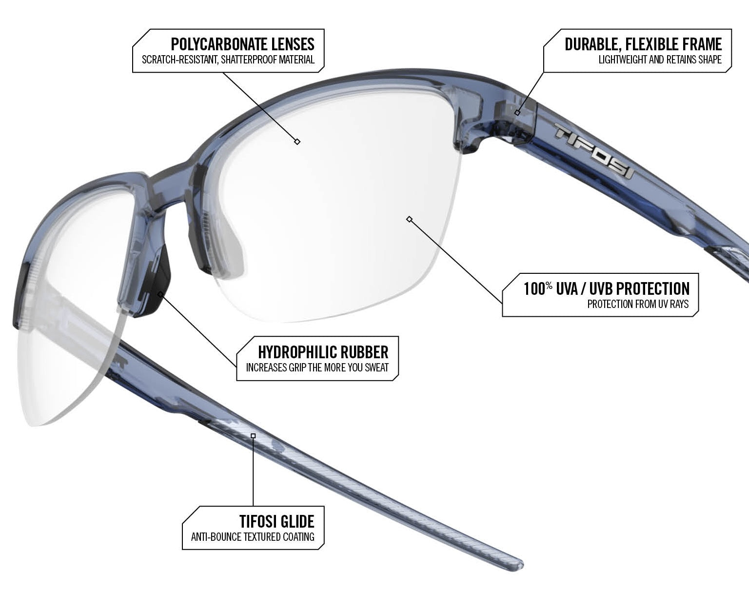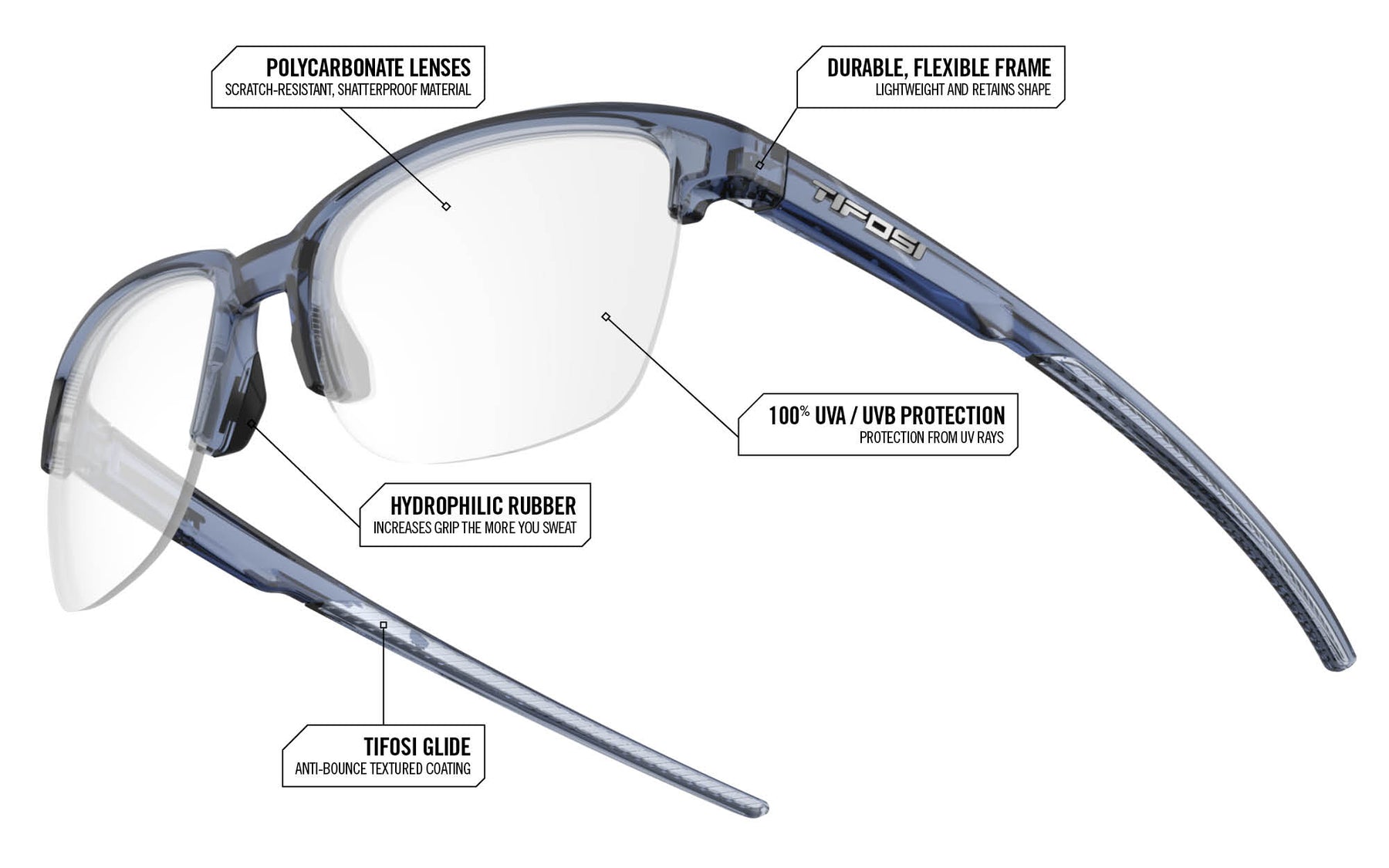 Introducing Suvo — Tifosi's prescription eyewear that blends expanded coverage with effortless style. Featuring a more rounded lens for expanded field of view and a sleek half-frame design, Suvo moves seamlessly from high-energy pursuits to low-key moments, giving you the versatility to transition without missing a beat.