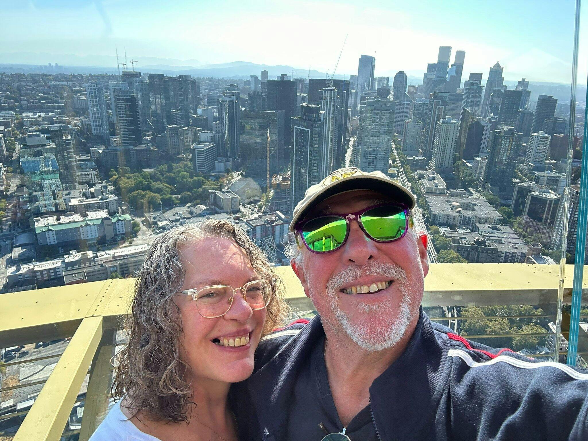 Girl sitting at outside cafe while smiling and clasping hands wearing purple frame sunglasses